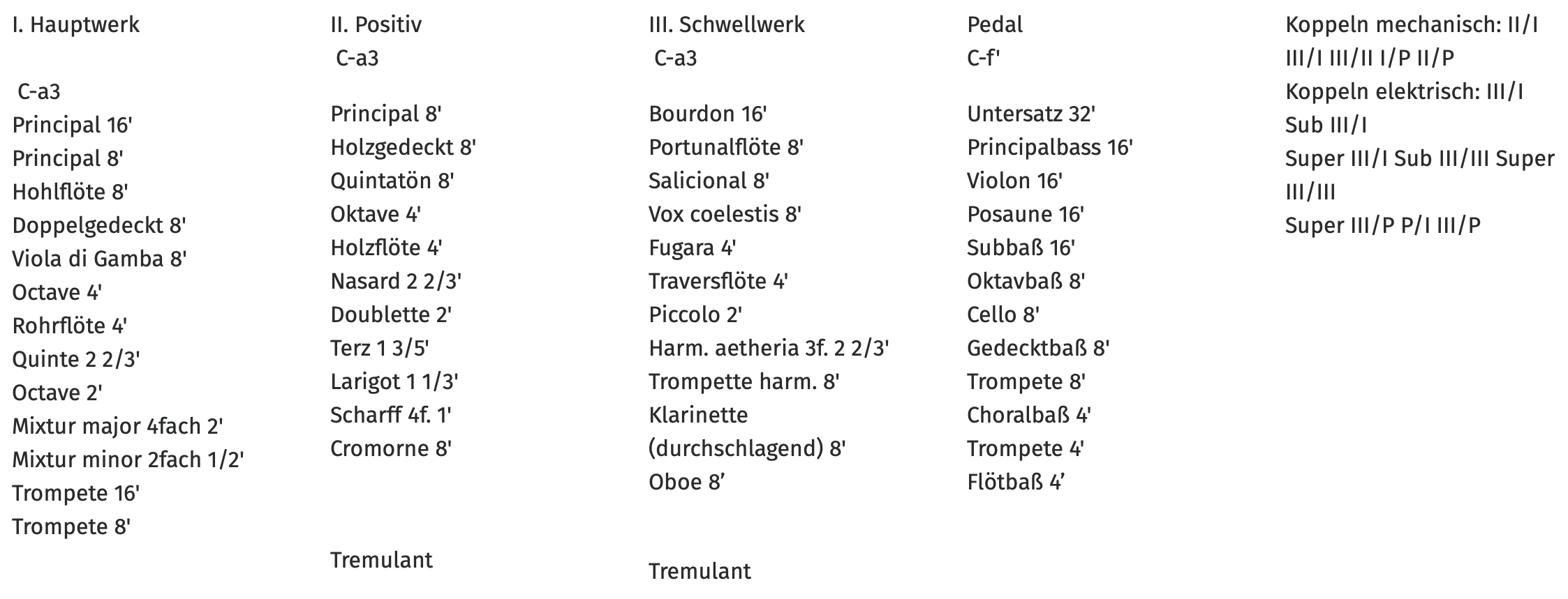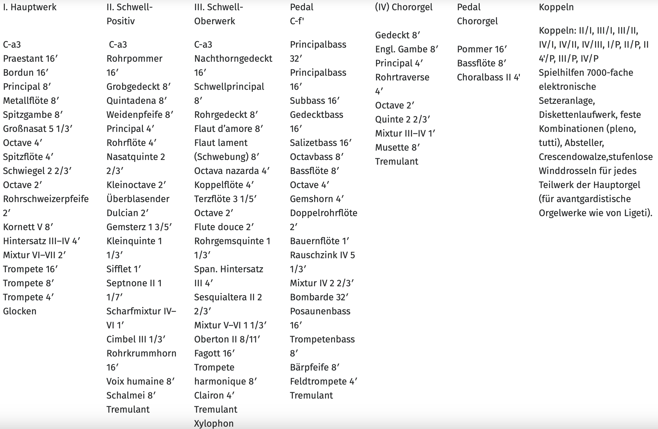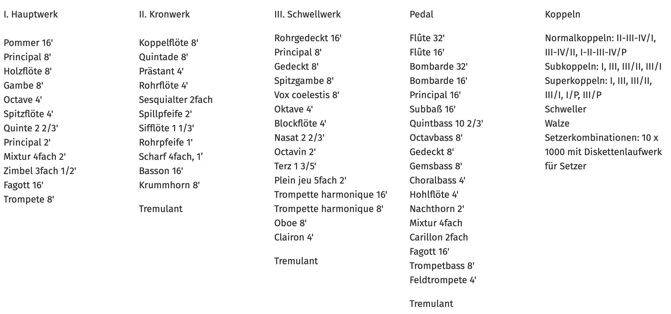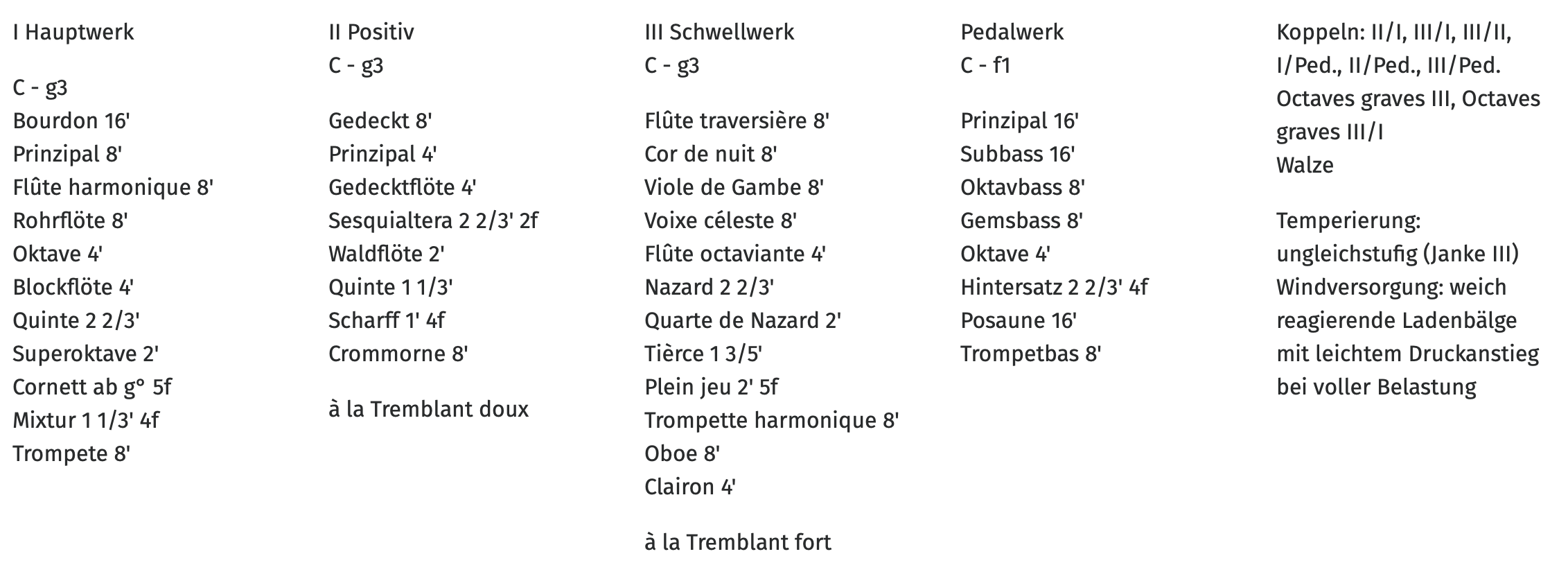 - Hauptwerk: Lade für 16 Stimmen, darunter acht 8’-Stimmen, 2 Streicher und Oboe d’amour, zehnfache Terzmixtur