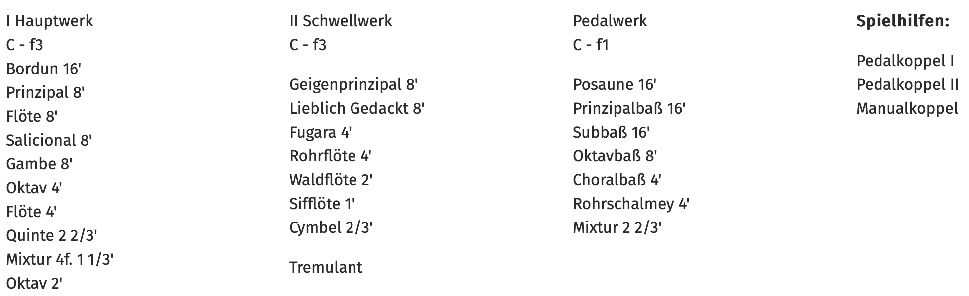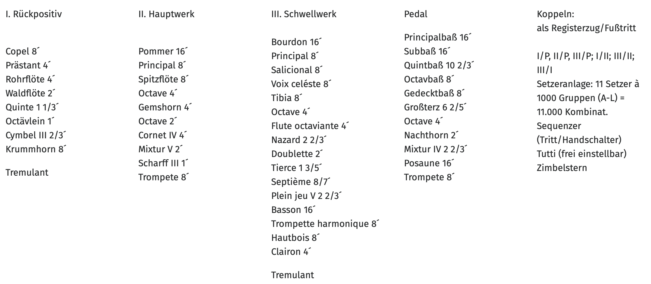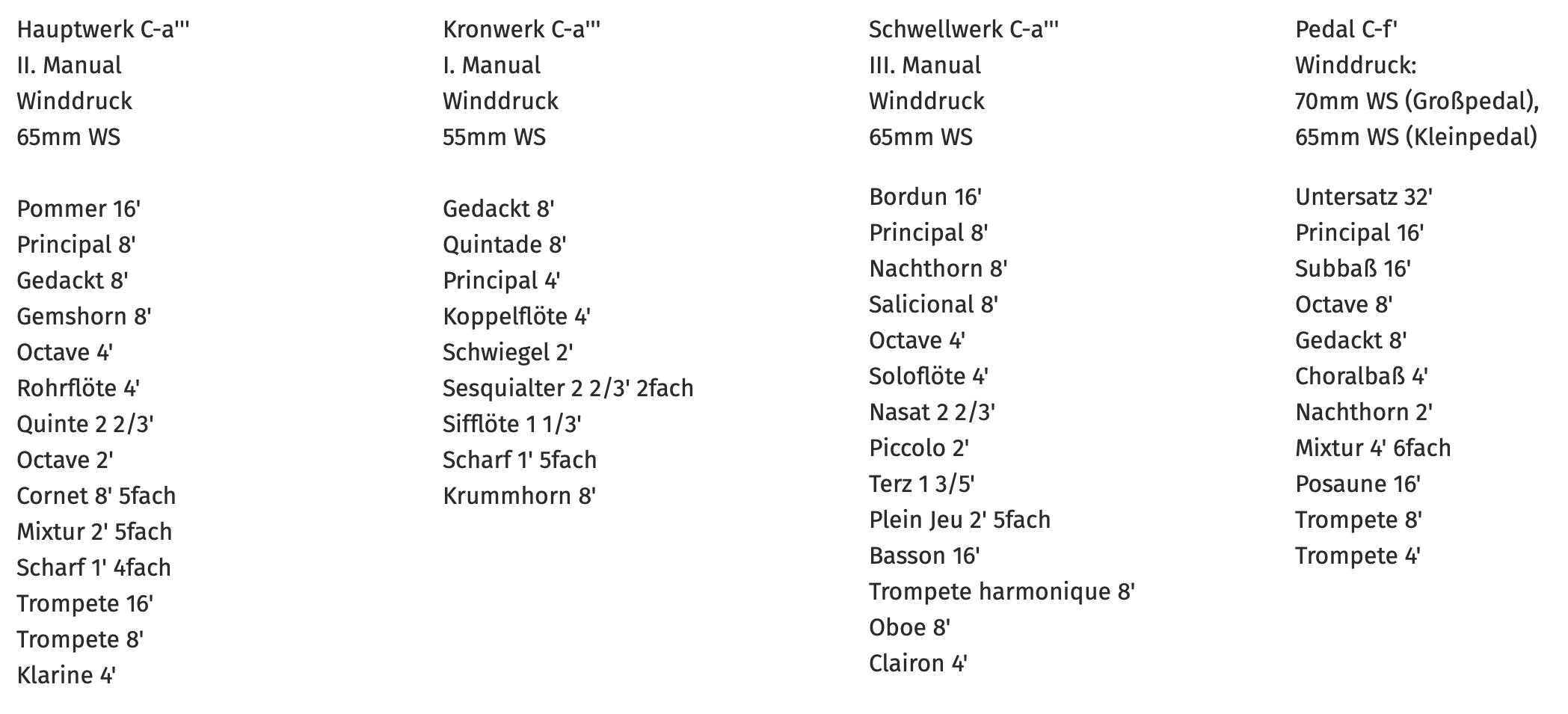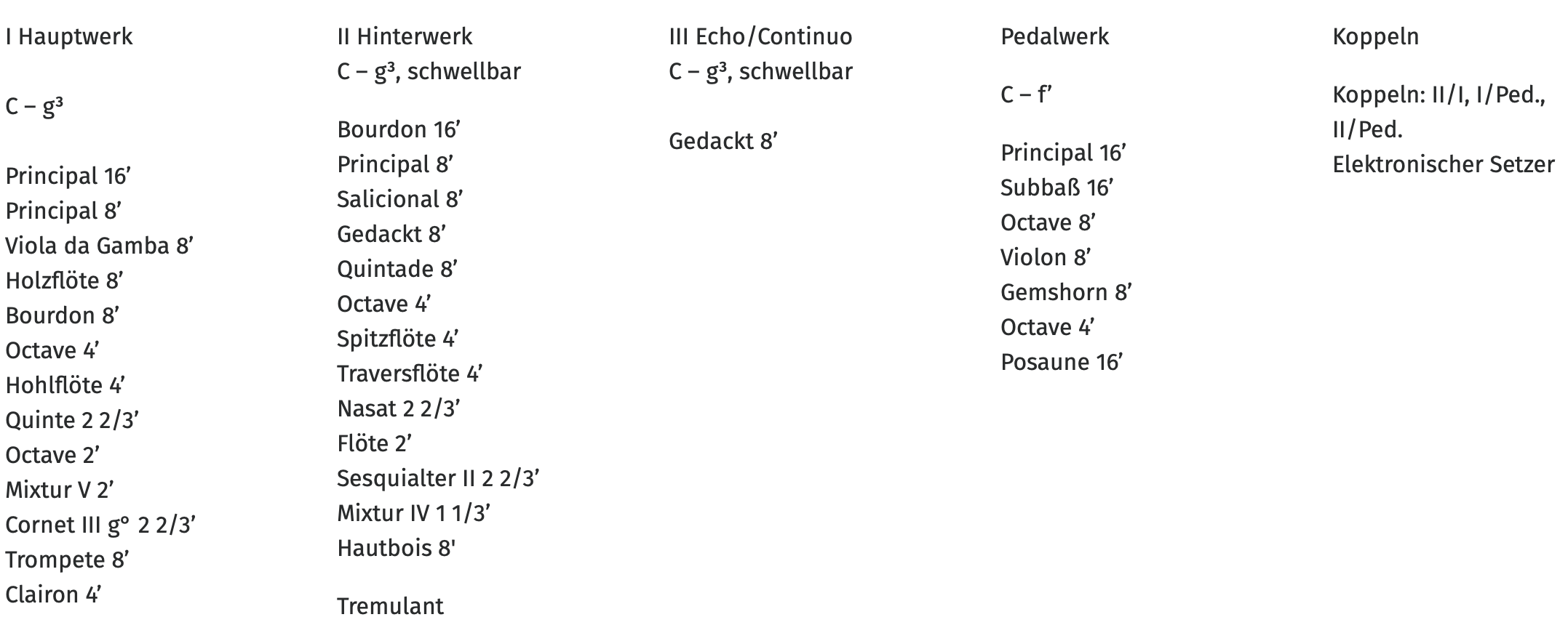 - Hauptwerk: Lade für 16 Stimmen, darunter acht 8’-Stimmen, 2 Streicher und Oboe d’amour, zehnfache Terzmixtur