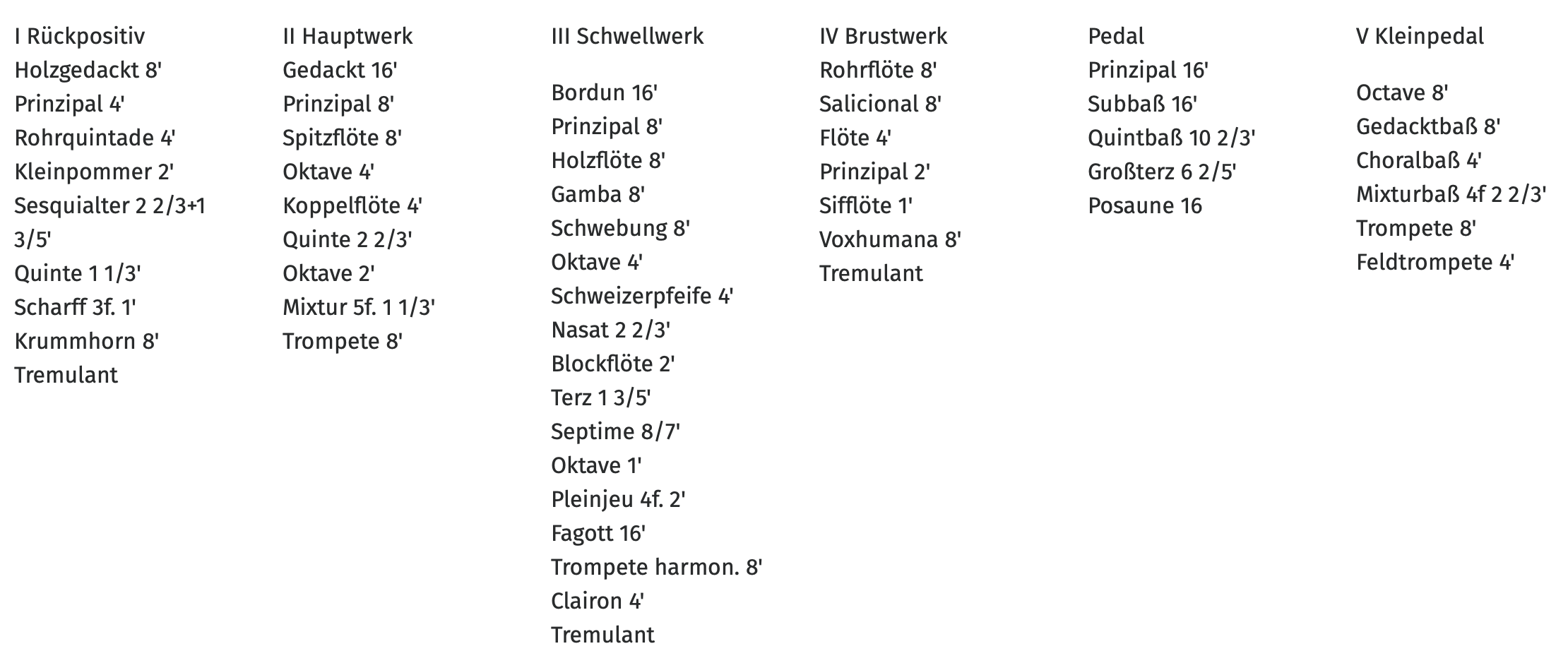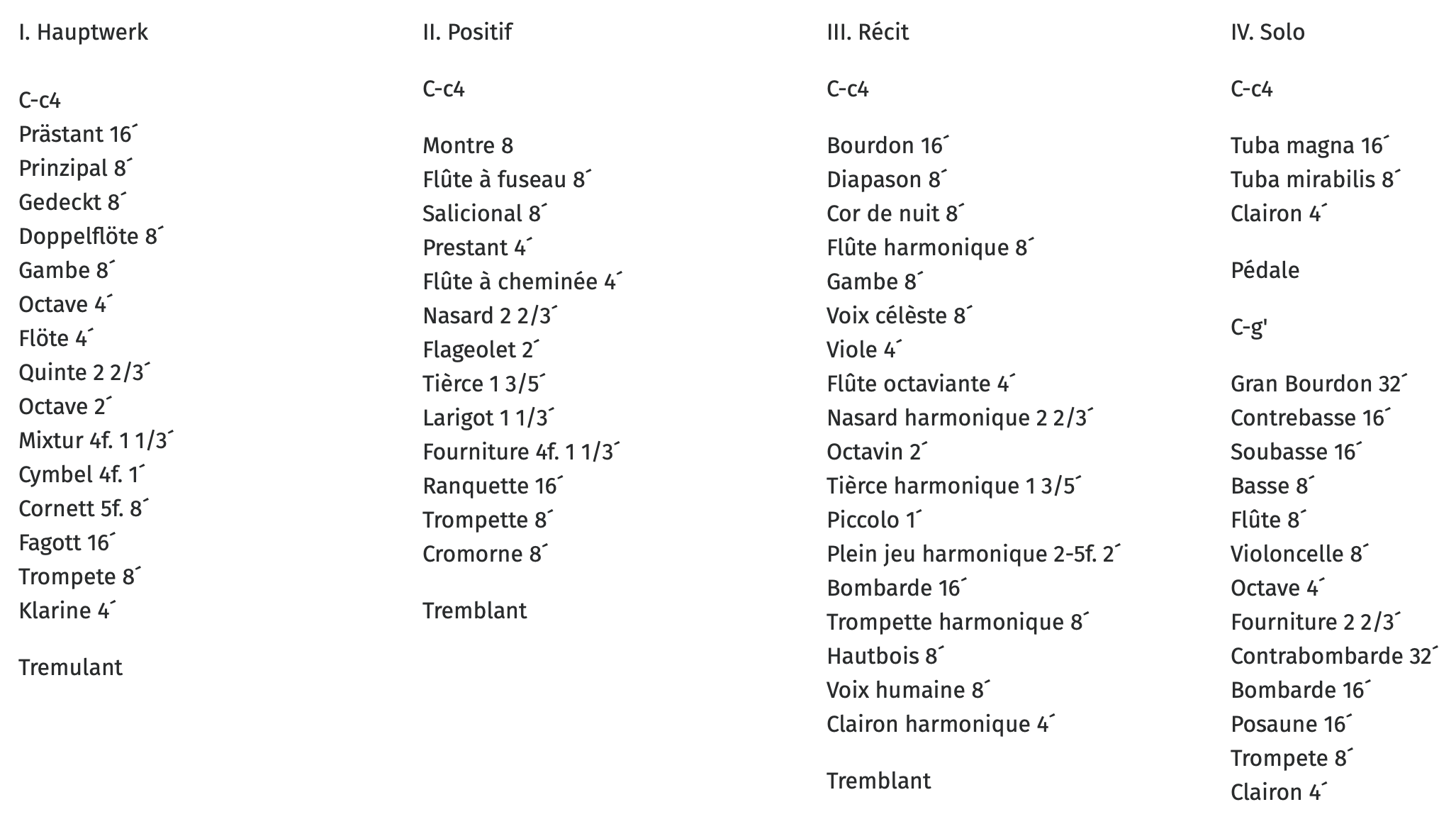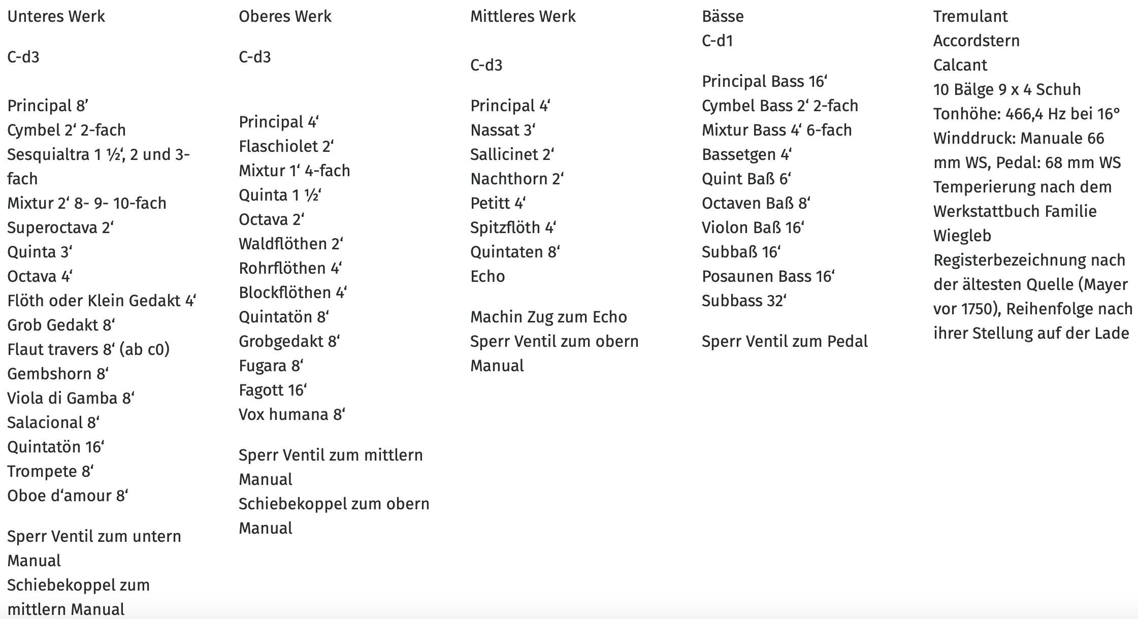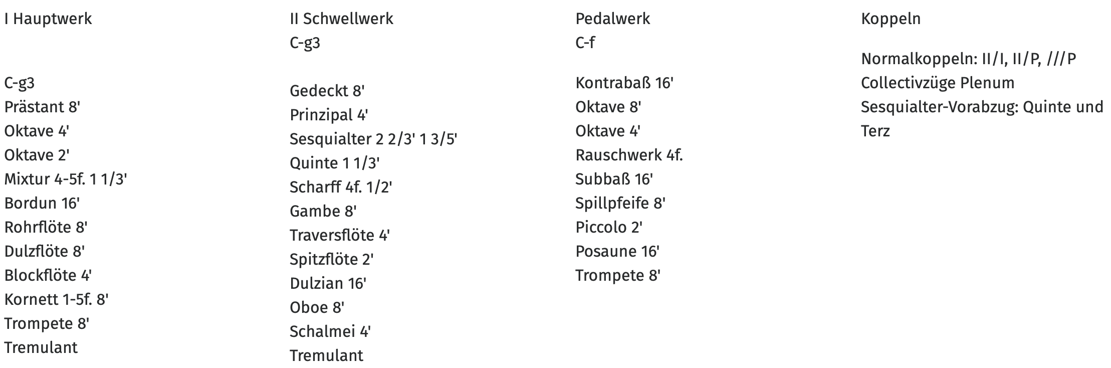 - Hauptwerk: Lade für 16 Stimmen, darunter acht 8’-Stimmen, 2 Streicher und Oboe d’amour, zehnfache Terzmixtur